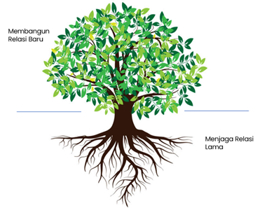 Bayangkan sebuah pohon. Akar dan daun memiliki fungsi berbeda, tapi sama pentingnya. Akar mewakili relasi lama – koneksi, mitra dan reputasi yang diwariskan pendiri. Daun mewakili relasi baru – jejaring modern, kolaborasi lintas industri, dan mitra dari generasi digital.
