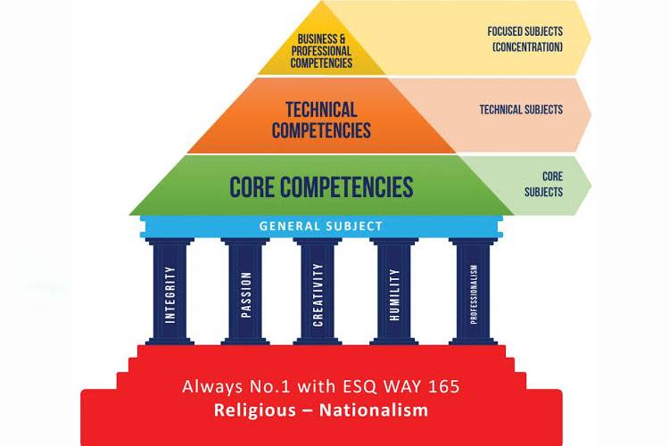 Pondasi yang perlu dimiliki oleh mahasiswa ESQ Business School adalah religius dan nasionalisme, kecintaan terhadap agama juga nasionalisme, sehingga ini yang akan menopang manusia agar tetap tegak dan tak runtuh. Kemudian pilar yang lima adalah values yang ada dalam satu kesatuan, yakni integrity, passion, creativity, loyalty humility, dan professionalism. Mahasiswa ESQ Business School juga kokoh atas dasar lima nilai yang senantiasa dipegang untuk menjalani kehidupan. Dan tak terlupakan, atap dari pembangunan manusia di ESQ Business School adalah dengan hadirnya kecerdasan intelektual melalui pembelajaran mata kuliah di kampus. “Kunci nomor empat adalah mempergunakan talentDNA.”