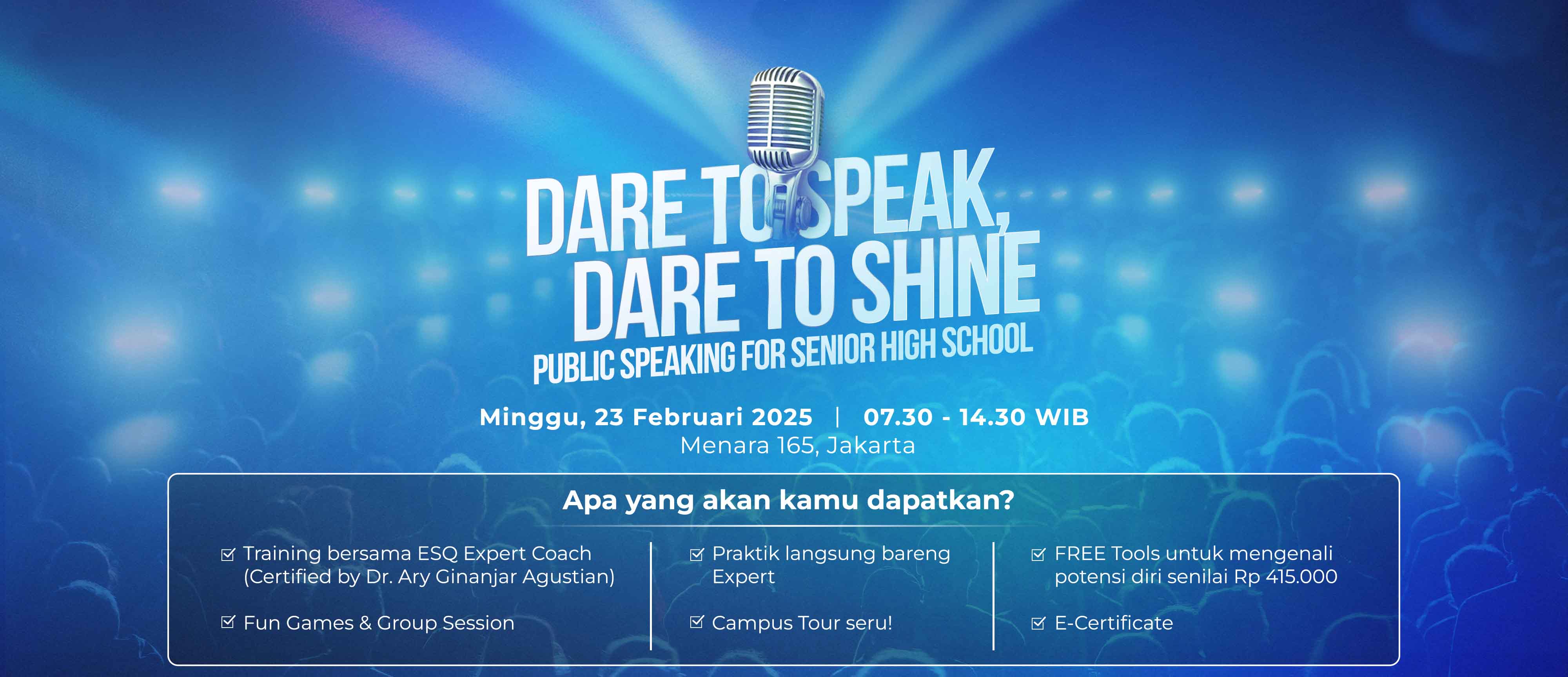 Sebuah acara khusus bagi siswa SMA yang ingin meningkatkan kepercayaan diri dalam berbicara di depan umum. Kami menghadirkan sesi pelatihan public speaking yang interaktif dan menyenangkan, langsung dari para ahli!